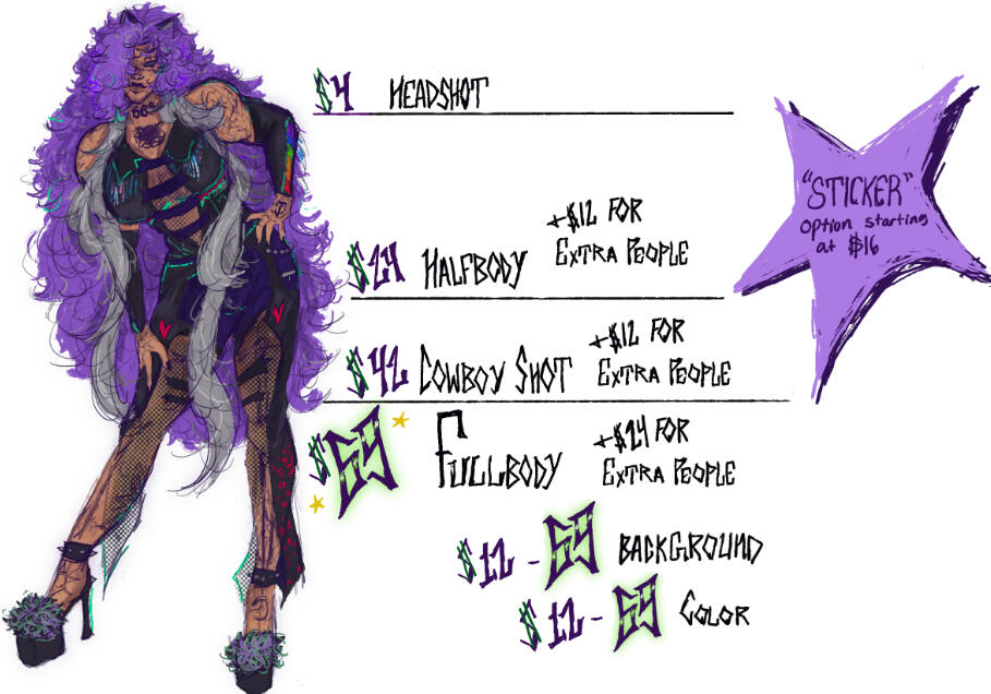 - Turnaround time not determined as my commission work hours can be unpredictable. I will let you know if I think it will take a while- Prices are subject to change based on the complexity of the request.- I have the right to reject a commission for any reason.- I will keep you updated on the progress of your commission- I take full payment before I start- I will retain all rights over the commissioned artwork and may post it on social media- You may upload the artwork you commissioned on social media (with credit) and have the rights to personal use of the artwork.- You may NOT profit further from the commissioned artwork (reselling, prints, reproduction, etc.)- You may NOT alter the commissioned artwork- You may NOT claim the artwork as your own.- You cannot use my work for commercial or NFTs- If you read all terms and conditions and are willing to pay double the price I may draw nsfw and suggestive art